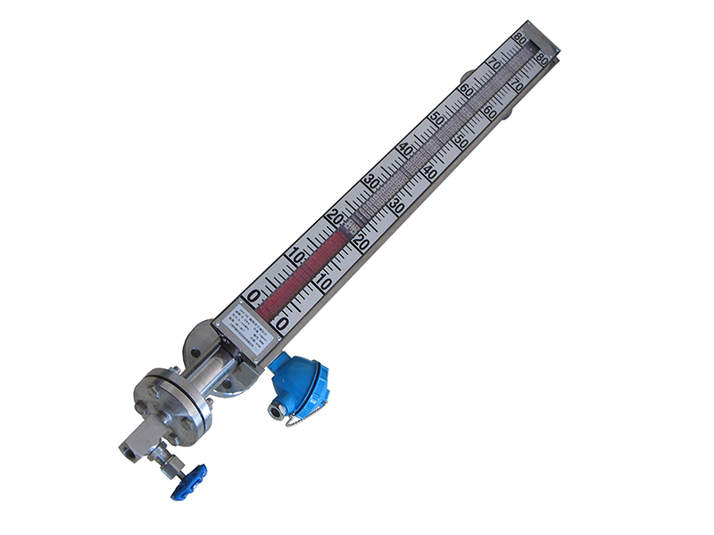 磁翻板液位指示器是安装在桶槽外侧或顶部,用以指示和控制桶槽内液位高度的一种现场指示及控制的仪表,指示器由磁性色片组成,当本体管内的磁性浮球随液位上升时,磁性色片由于磁场的作用发生翻转,颜色由红色变为白色或由白色变为红色,即可显示液位高度,实现就地显示。根据用户需要,也可在本体管上安装4-20mA 远传信号变送器、开关信号传送器、数字液位显示器等。磁翻板液位指示器适用于开放或封闭压力容器内的液位或界面测量。高温、高压、低密度特殊浮子的设计,不锈钢SUS304 或SUS316L、特富龙PTFE、聚丙烯PP 等防腐材料的选用,X-射线探伤检测,冷轧拉孔焊接等优质材料及技术的应用,可以保证产品适用于任何现场。